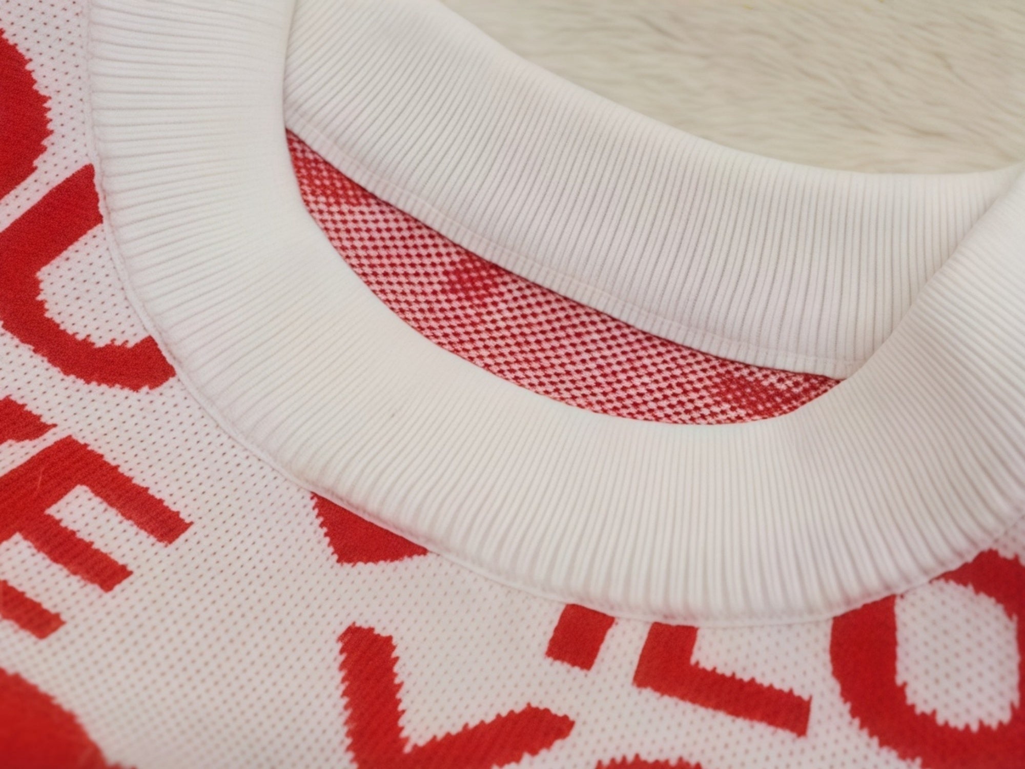 A bright red knit sweater with a playful heart-letter look and a stretchy neckline that wonât feel tight. Soft inside, detailed outsideâperfect for cozy walks, photos, and everyday layering in cooler weather.
