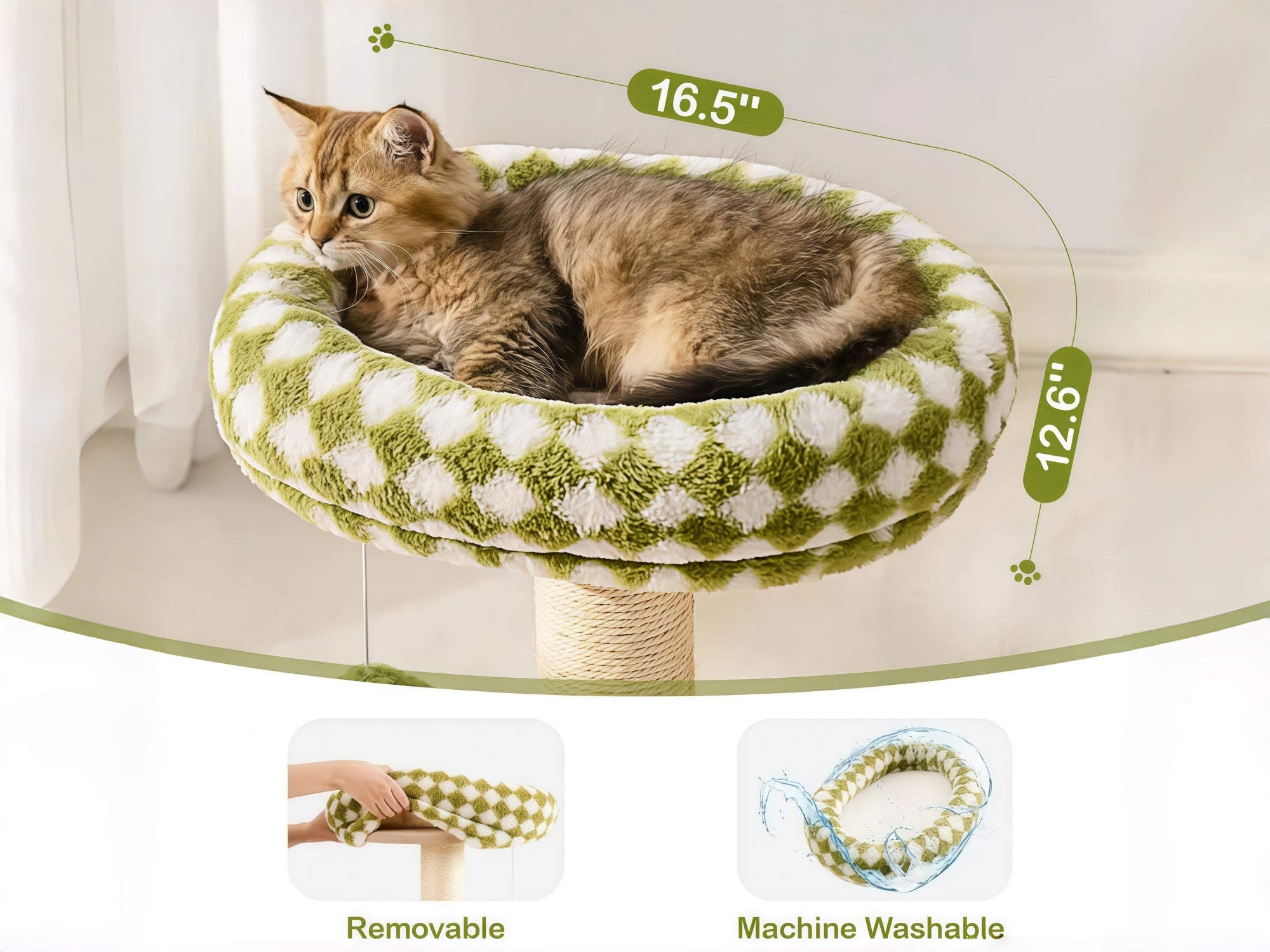 A plush 16.5" × 12.6" top bed gives cats a warm lookout for bird-watching and sunbathing. The removable, machine-washable cover keeps their favorite nap spot fresh with minimal effort.